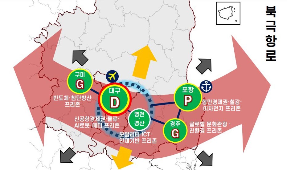 대구·경북 GDGP 글로벌 해륙 프리존 도시회랑 구상. 대구정책연구원 제공 이어 “영일만항을 중심으로 ‘대구와 경북의 구미(G)·대구(D)·경주(G)·포항(P)’을 연결하는 북극항로 개척의 전략거점회랑이 중요한 역할을 수행해야 한다”며 "대구의 전략적 요충지 기능과 대구경북신공항 및 사통팔달 광역 교통망을 이용한 대구의 물류허브역할이 영일거점항만과 고도로 연계된 회랑이 구축돼야 한다"고 밝혔다. 박 원장은 특히 북극항로 연계 대구경북의 GDGP 전략거점회랑을 ‘세계자유도시회랑’으로 크게 발전시켜야 한다고 했다. 대상 구역도 구미~대구와 영천·경산~경주~포항 을 제안했다.