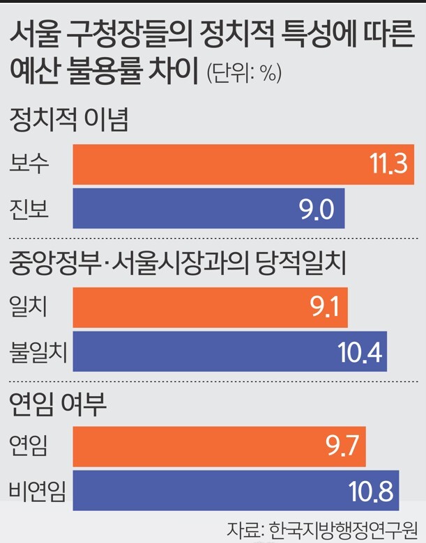 최 교수가 서울 구청장들의 정치적 이념 성향에 따른 예산 불용률과 집행률을 분석한 결과 보수 성향은 평균 11.耳%의 예산 불용률을 보인 반면 진보 성향 구청장은 9.0%인 것으로 나타났다. 예산집행률에서도 차이를 보여 보수 성향 구청장의 경우 평균 82.6%였으나, 진보 성향은 85.2%로 약 2.6%포인트 높은 수준이었다.