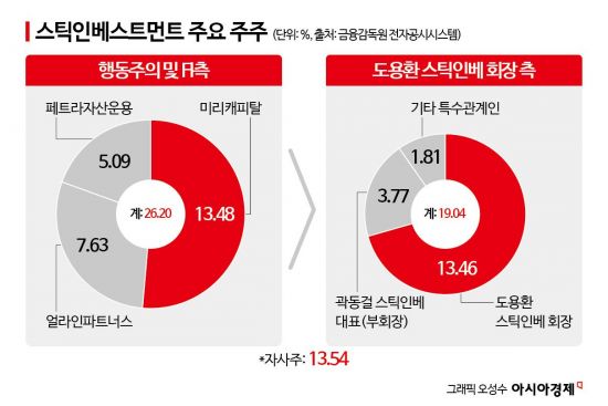 갈등이 더욱 주목받는 이유는 스틱의 지분 구조가 이미 행동주의 진영에 유리하게 기울어졌기 때문이다. 현재 도 회장 측 지분은 19.04%다. 도 회장이 13.46%로 가장 많고, 곽동걸 스틱인베 부회장(3.77%)이 그다음이다. 이 밖에 도 회장의 아들 2명 및 회사 파트너급 임원 등 특수관계인 지분이 1.81%다.
