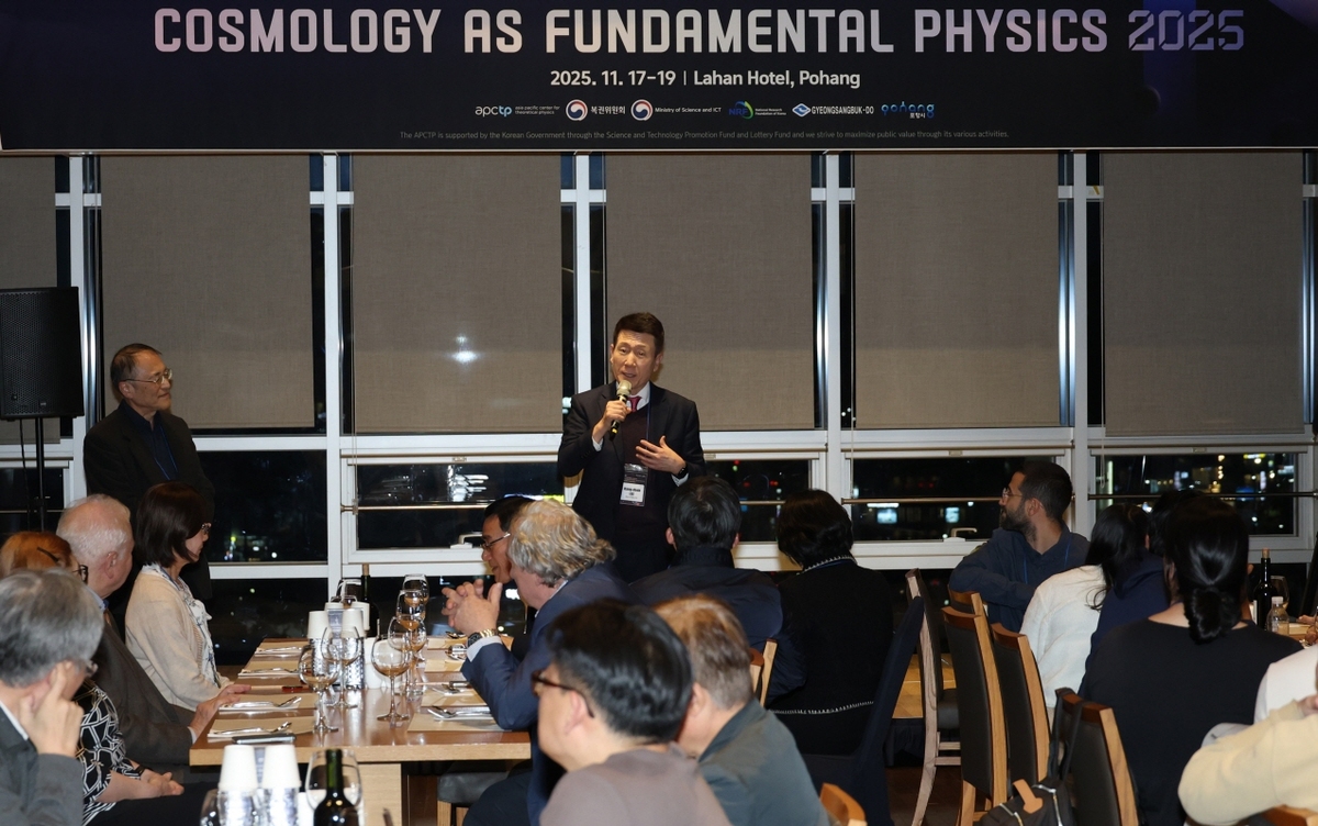 아시아태평양이론물리센터(APCTP)가 주관한 ‘2025 아태이론물리센터 국제컨퍼런스’가 지난 18일 포항 라한호텔에서 열린 가운데 참석자들이 기념촬영을 하고 있다. 포항시 제공 19일 포항시에 따르면 아태이론물리센터 사사키 미사오 신임 소장 취임을 기념해 ‘근본 물리학으로서의 우주론’을 주제로 열린 이번 행사에는 세계적 우주론·중력이론 연구자들이 한자리에 모여 최신 연구 성과를 공유했다. 컨퍼런스에는 천 피신 타이완대학교 석좌교수, 수냐예프 라시드 막스플랑크 천체물리연구소 명예소장, 알렉산더 쿠센코 UCLA 교수 등 세계 석학 14명이 연사로 참여했다.
