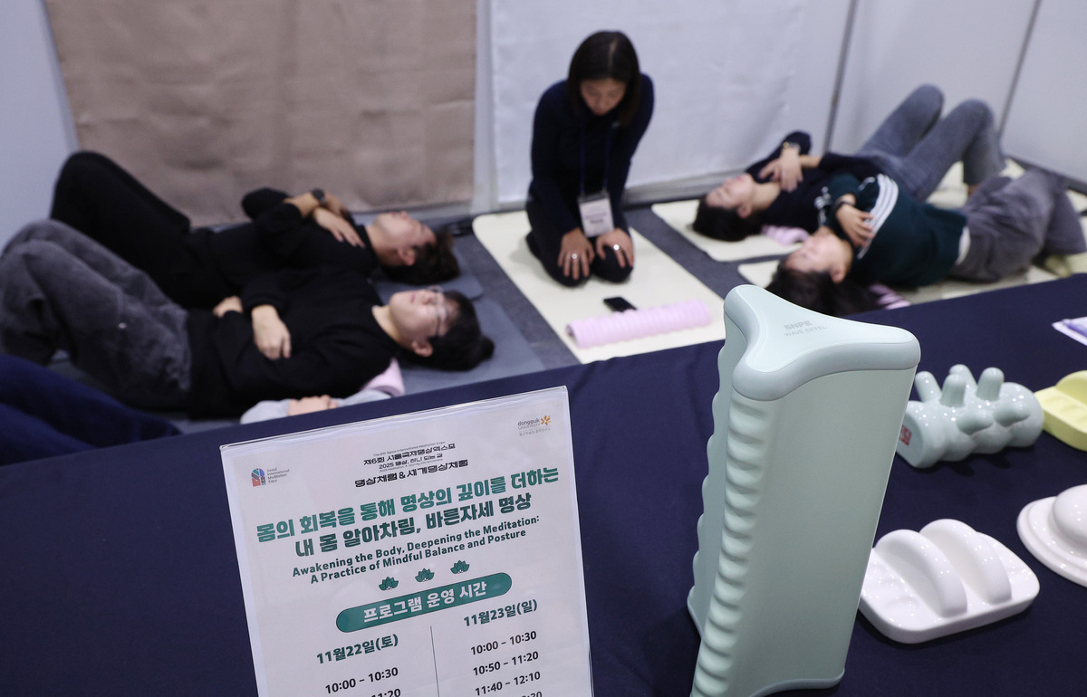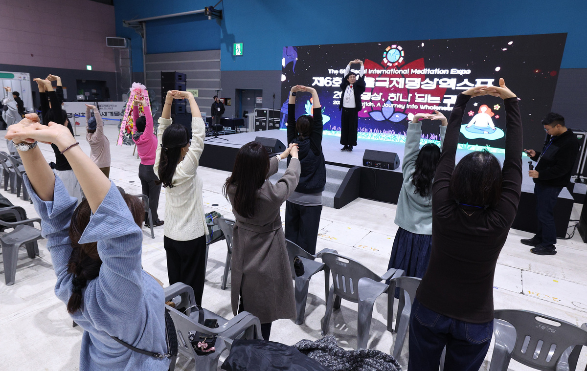 23일 서울 강남구 SETEC에서 열린 '제6회 서울국제명상엑스포'를 찾은 관람객들이 명상 체험을 하고 있다. '명상, 하나 되는 길'을 주제로 열린 이번 행사는 전통 명상의 현대적 계승과 글로벌 명상문화 확산 위해 마련됐다.