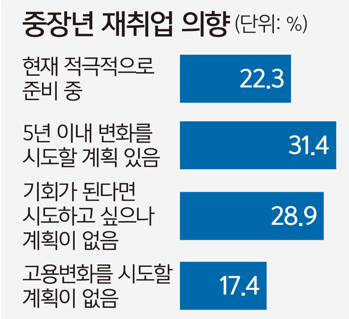 최 교수는 “(중장년층이) 주된 일자리를 떠나더라도 다른 일자리에서 충분히 노동시장 경쟁력을 가질 수 있도록 정책의 범위를 넓히자는 취지”라며 “자신의 상태를 객관적으로 알 수 있는 진단 도구 등 사회적 인프라부터 정비가 될 필요가 있다”고 지적했다.