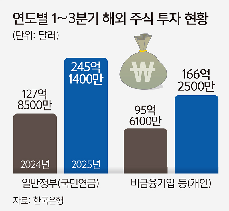 30일 한국은행에 따르면 올해 1∼3분기 ‘일반정부’의 해외 주식 투자는 총 245억1400만달러로 집계됐다. 작년 동기(127억8500만달러)보다 92% 증가했다. 같은 기간 ‘비금융기업 등’의 해외 주식 투자는 95억6100만달러에서 166억2500만달러로 74% 늘었다. 통상 일반정부는 국민연금, 비금융기업 등은 개인투자자로 해석해도 무방하다는 게 한은의 설명이다.
