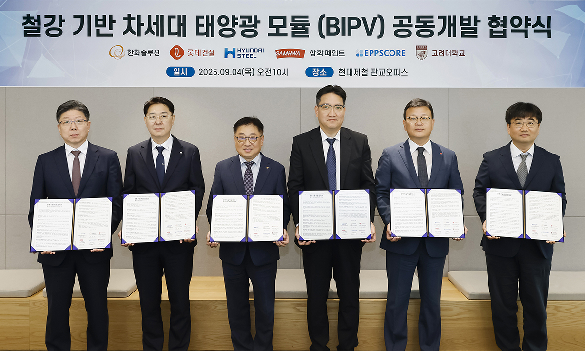 롯데건설 ‘건물 일체형 태양광 발전’ 추진 롯데건설은 차세대 ‘건물 일체형 태양광 발전시스템’(BIPV) 개발을 추진한다고 밝혔다. 롯데건설은 현대제철·한화솔루션·삼화페인트·엡스코어·고려대와 차세대 유리-철판 접합 방식(Glass to Steel·GtoS)의 BIPV 공동 기술 개발에 관한 업무협약(사진)을 체결했다. 협약은 제로에너지 건축물 의무화에 선제적으로 대응하기 위한 것으로, GtoS BIPV의 성능 향상과 건축물 적용 가속화를 목표로 한다. 롯데건설은 “탄소중립 실현에도 기여하는 중요한 계기가 될 것”이라고 전했다.