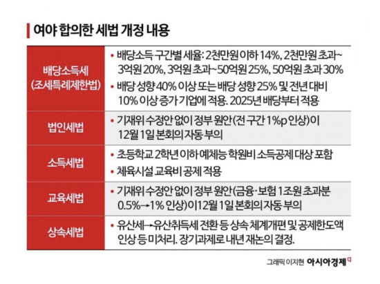 내년 세입과 관련된 세법은 여야 간 조율이 끝났다. 여야 합의 처리가 안 될 경우, 국회법 자동부의 조항 등으로 세법이 정해질 수도 있다는 점이 고려됐다. 과반 의석을 확보한 여당의 뜻이 반영된 형태로 세법이 정리될 수 있는 상황에서 국민의힘이 타협에 나선 셈이다. 전날 국회 기획재정위원회는 조세소위원회와 전체회의를 잇따라 열고 기재위 소관 예산부수법안 등을 의결했다. 배당소득 분리과세에서 50억 원 초과 구간을 신설하고 최고세율을 30%로 적용하는 내용의 조세특례제한법 일부개정법률안 등이 처리됐다.