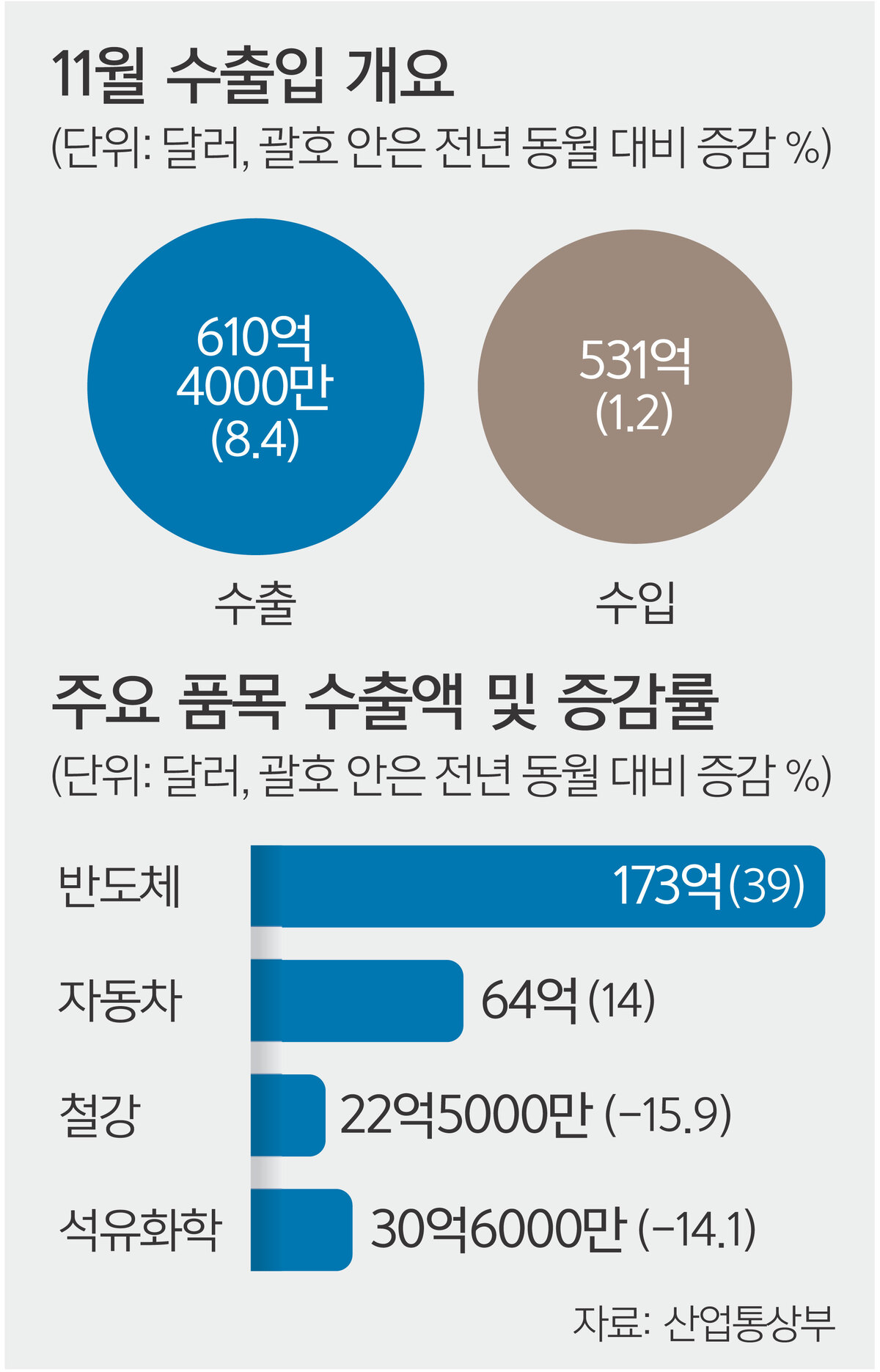 15대 주력 수출 품목 중에는 6개 품목의 수출이 증가했다. 특히 반도체는 38.6% 증가한 172억6000만달러로 최대 월간 수출 기록을 갈아치웠다. 인공지능(AI) 열풍에 따라 데이터센터를 중심으로 고대역폭 메모리(HBM), DDR5 등 고부가 메모리에 대한 높은 수요가 메모리 가격 상승세로 이어지며, 9개월 연속 상승세를 기록했다. 자동차 수출은 미국의 25% 품목 관세 영향에도 내연기관과 하이브리드차 호실적에 힘입어 지난해보다 13.7% 증가한 164억1000만달러를 기록했다.