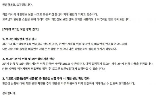 G마켓은 계정에 등록돼 있던 카드로 상품권(환금성 상품)이 무단으로 결제된 것과 관련해서는 "본인 확인용 추가 인증을 의무 적용해 안전하게 거래할 수 있도록 조치했다"고 밝혔다.