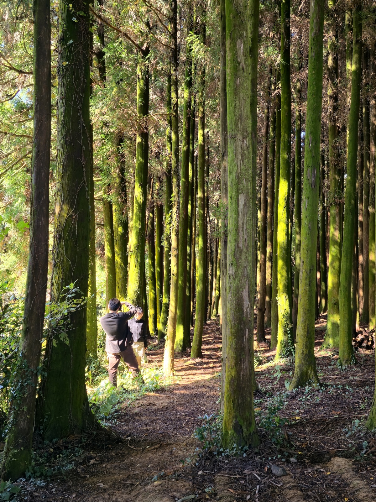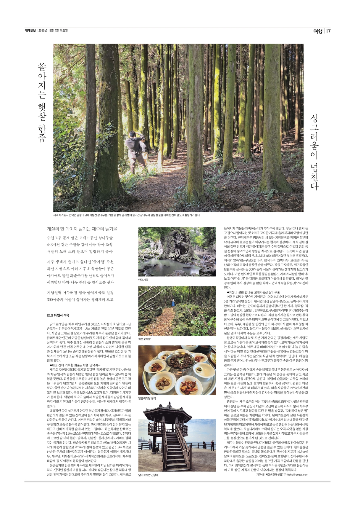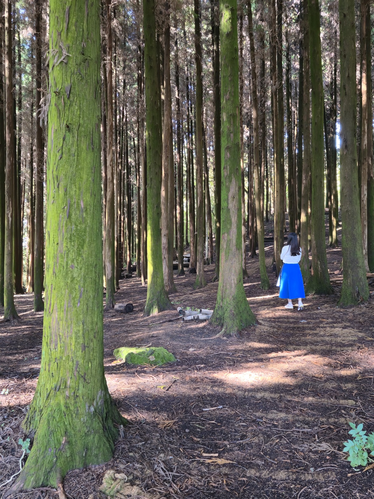 안덕면 광평리 고배기동산 삼나무숲. 달팽이식당에서 차로 20분 거리 안덕면 광평리에는 제주 사람도 잘 모르는 아름다운 숲이 보석처럼 숨어 있다. 고배기동산에 자생하는 삼나무숲이다. ‘제주메밀 비비작작면’으로 입소문 나 늘 긴 줄을 서야 하는 메밀 맛집 한라산아래첫마을을 운영하는 영농조합이 마을 사람들과 꾸며가는 숲으로 식당 뒤쪽 언덕에서 만난다. 하늘을 향해 곧게 뻗어나간 삼나무 수천그루가 울창한 숲을 이룬 풍경이 장관이다. 가끔 햇살 한 줌 어렵게 숲을 비집고 삼나무 몸통으로 쏟아지자 싱그러운 생명력을 더한다. 20대 커플은 이 순간을 놓치지 않고 서로의 예쁜 시간을 사진으로 남긴다. 바람에 흔들리는 나뭇잎 소리와 이름 모를 새들의 노래 즐기며 힐링하기 좋은 곳이다. 광평리 마을은 ‘제주 4·3 사건’ 때 폐허가 됐는데, 마을 사람들이 1955년 재건하면서 삶의 터를 내어준 자연에 감사하는 마음을 담아 삼나무숲을 조성했다.