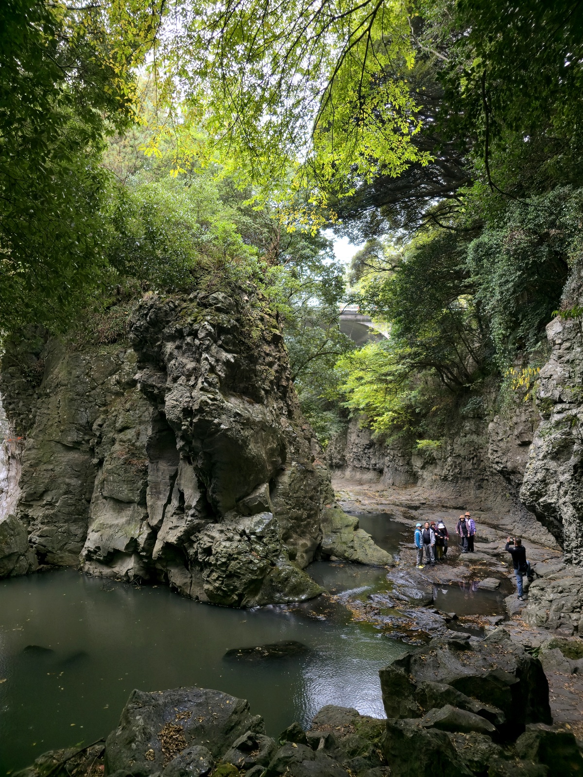 안덕계곡. 화순곶자왈 인근 안덕계곡에도 제주만이 지닌 남다른 매력이 가득하다. 안덕면 감산리 마을을 지나 바다로 유입되는 창고천 하류에 형성된 안덕계곡은 한대오름 주위에서 발원한 물이 흐른다. 계곡으로 들어서자 겨울을 재촉하는 비가 추적추적 내린다. 우산 하나 받쳐 들고 걸으니 떨어지는 빗소리가 고요한 계곡에 울려 퍼지며 여행의 낭만을 더한다. 안덕계곡은 병풍처럼 서 있는 기암절벽과 평평한 암반바닥에 유유히 흐르는 물이 어우러지는 협곡이 절경이다. 계곡 전체 길이의 절반 정도가 이런 깎아지른 듯한 수직 절벽으로 이뤄져 용암 동굴 천장이 붕괴하면서 형성된 계곡으로 짐작된다.