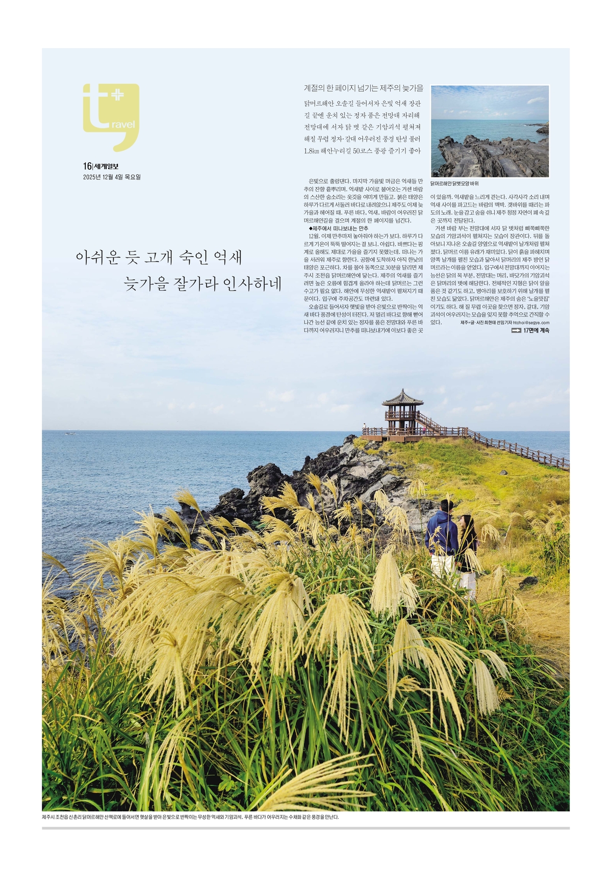 세계일보 여행면. 편집=김창환 기자 ◆제주에서 떠나보내는 만추 12월. 이제 만추마저 놓아줘야 하는가 보다. 하루가 다르게 기온이 뚝뚝 떨어지는 걸 보니. 아쉽다. 바쁘다는 핑계로 올해도 제대로 가을을 즐기지 못했는데. 떠나는 가을 서러워 제주로 향한다. 공항에 도착하자 아직 한낮의 태양은 포근하다. 차를 몰아 동쪽으로 30분을 달리면 제주시 조천읍 신촌리 닭머르해안에 닿는다. 제주의 억새를 즐기려면 높은 오름에 힘겹게 올라야 하는데 닭머르는 그런 수고가 필요 없다. 해안에 무성한 억새밭이 펼쳐지기 때문이다. 입구에 주차공간도 마련돼 있다.
