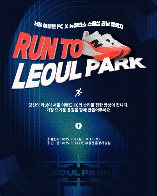 사진=서울 이랜드 FC 제공 프로축구 K리그2 서울 이랜드 FC가 오는 13일 목동운동장에서 열리는 수원삼성과의 홈경기를 맞아 뉴발란스 브랜드데이를 개최한다. 이에 앞서 8일부터 13일까지 팬 참여형 이벤트인 ‘런 투 레울파크(Run to LEOUL PARK) 챌린지’를 진행한다. 최근 뜨거운 러닝 문화를 접목한 이번 챌린지는 기간 내 3km 또는 30분 이상 러닝을 1회 이상 완료하면 참여할 수 있다.