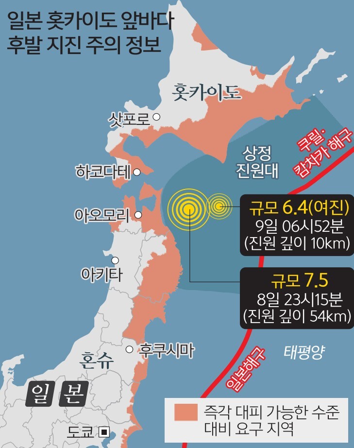 일본 기상청이 9일 ‘홋카이도·산리쿠 앞바다 후발 지진 주의 정보’를 발표했다. 2022년 12월 도입된 이 경보 시스템이 작동하기는 처음으로, 전날 밤 아오모리현에서 일어난 규모 7.5의 강진 이후 평상시보다 거대 지진 발생 가능성이 커졌다고 판단한 것이다. 2만명 이상의 사망·실종자가 나온 2011년 동일본 대지진 당시에도 규모 7.3의 강진 이틀 뒤 쓰나미를 동반한 더 큰 지진이 발생한 바 있어 일본은 경계심을 늦추지 않고 있다.
