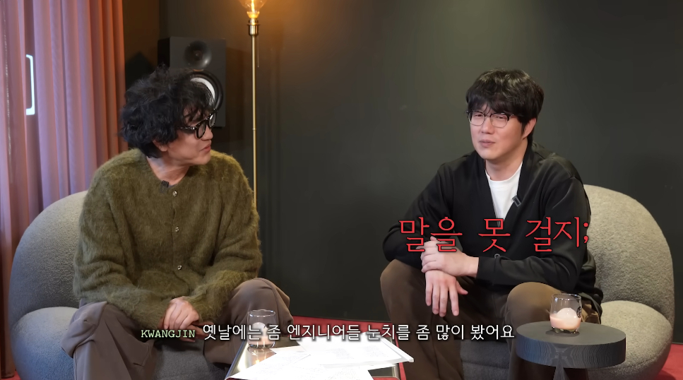 유튜브 채널 ‘성시경 SUNG SI KYUNG’ 영상 캡처 이날 성시경이 “옛날에 녹음하던 이야기만 풀어도 재미있는 게 많다”고 말하자 김광진은 “과거에는 녹음할 때는 음향 엔지니어 눈치를 많이 봤다”고 털어놓았다. 이 성시경은 “내 곡인데 마음대로 안 해준다. 엔지니어에게 말을 못 걸었다”며 동의했다.