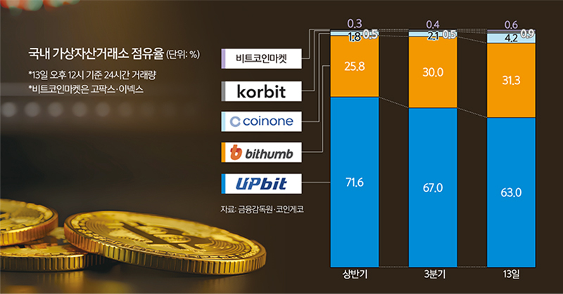 14일 가상자산 통계사이트 코인게코에 따르면 전날 기준 국내 가상자산시장 거래대금 점유율은 업비트가 63.0%로 1위를 기록했고 빗썸(31.3%)과 코인원(4.20%), 코빗(0.92%)이 뒤를 이었다.