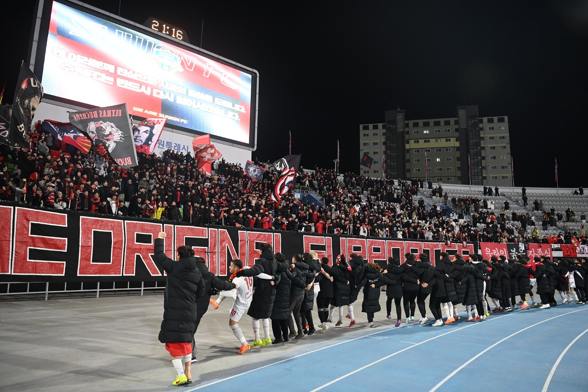 부천FC1995 구단이 K리그1(1부) 무대에 오른다. 2007년 팬들의 손으로 창단한 뒤 18년 만의 첫 승격이다. 조용익 부천시장은 “최고의 선수와 감독·코치진·스태프 그리고 헤르메스 서포터스가 함께 만들어낸 결과”라며 “부천이 최고라는 것을 1부에서도 증명하자”고 소감을 밝혔다. 부천시는 최근 수원FC와의 승강 플레이오프(PO)에서 1차전 1-0, 2차전 3-2로 연승을 거두며 합계 4-2로 1부 입성에 성공했다고 15일 밝혔다. 시는 부천FC1995를 시민 중심의 명문 구단으로 키우고, 종합운동장과 도심 일대를 시민 스포츠·문화 복합공간으로 발전시킬 계획이다. 프로축구 전용구장 도입도 검토한다.