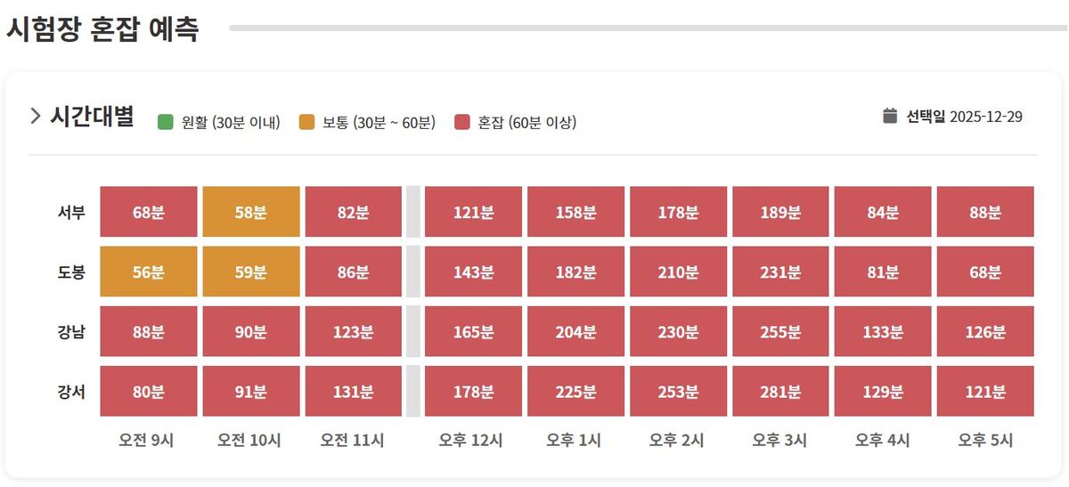 오는 29일 운전면허시험장 혼잡도 예측. 안전운전 통합민원 홈페이지 도로교통공단은 과거 데이터를 기반으로 서울의 운전면허시험장 혼잡도를 예측한 자료를 제공하고 있다. 이에 따르면 오는 22일 대기 시간은 최소 25분(도봉운전면허시험장)에서 최대 146분(강서면허시험장)이 걸릴 것으로 예상됐다. 이후 대기 시간은 계속 늘어나 29일 오후3시 281분(강서면허시험장)으로 정점을 찍을 것으로 예측됐다. 앞서 지난해 12월에는 갱신 대상자가 대거 운전면허시험장으로 몰리면서 점심시간을 이용해 방문했다가 오후 전체를 허비했다는 후기가 속출했다.