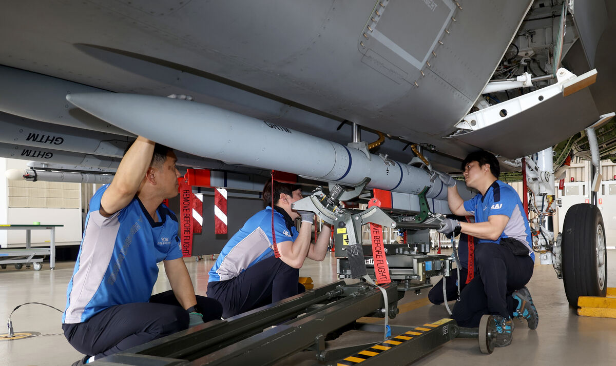 경남 사천 한국항공우주산업(KAI) 본사 격납고에서 KAI 직원들이 KF-21 시제기에 미티어 장거리 공대공미사일을 장착하고 있다. 세계일보 자료사진 국산 항공무장 배치는 그 이후 시점이다. 단거리 공대공미사일은 2033~2035년, 장거리 공대공미사일은 2034~2038년 양산될 예정이다. 국산 무장 양산이 충분히 이뤄질때까지 전력공백을 메울 ‘갭 필러’로 미티어 등의 유럽산 공대공미사일을 충분히 확보할 필요가 제기되는 대목이다.