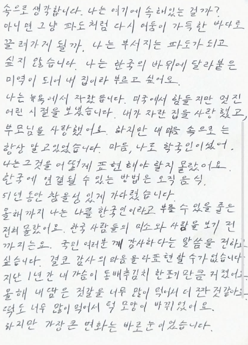자필편지. 에드워드 리 SNS 뉴욕에서 자라 미국에서 어린 시절을 보냈다는 그는 ‘마음속으로는 항상 한국인이었다’고 고백하며, 그 감정을 표현할 방법을 찾지 못했던 시간들을 돌아봤다. 그리고 “한국과 연결될 방법은 오직 음식이었다”며 오랜 시간 기다려온 끝에 지금의 자리에 이르렀다고 밝혔다. 한국에 연결될 수 있는 방법은 오직 음식이라고 말하며, ‘5년 동안 참을성 있게 기다렸습니다. 올해까지 나는 나를 한국인이라고 부를 수 있을 줄은 전혀 몰랐어요. 한국 사람들의 미소와 사랑을 보기 전까지는요. 국민 여러분께 감사하다는 말씀을 전하고 싶습니다. 결코 감사의 마음을 다 표현할 수가 없습니다’고 감사한 마음을 전했다.