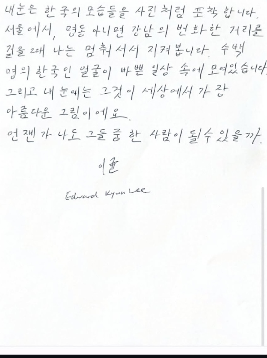 자필편지. 에드워드 리 SNS 마지막으로 그는 ‘내 눈은 한국의 모습을 사진처럼 포착한다. 서울 명동과 강남의 거리에서 마주치는 수많은 얼굴들은 세상에서 가장 아름다운 그림’이라고 말했다. 그리고 ‘언젠가 나도 그들 중 한 사람이 될 수 있을까’라며 조심스러운 물음을 남겼다. 에드워드 리는 2024년 방영된 넷플릭스 ‘흑백요리사: 요리 계급 전쟁’에 출연해 준우승을 차지했다. 방송 중 자신을 ‘이균’이라며 한국 이름을 밝히고 한식의 애정을 보여주며 대중의 큰 사랑을 받았다.