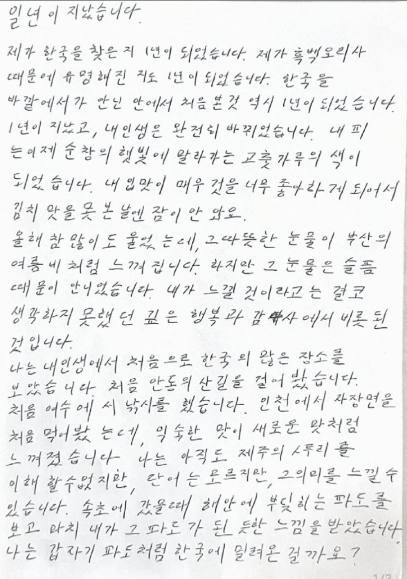 또 ‘내 인생에서 처음으로 한국의 많은 장소를 보았습니다. 처음 안동의 산길을 걸어봤습니다. 처음 여수에서 낚시를 했습니다. 인천에서 짜장면을 처음 먹어봤는데, 익숙한 맛이 새로운 맛처럼 느껴졌습니다. 나는 아직도 제주 스토리를 이해할 수 없지만, 단어는 모르지만, 그 의미를 느낄 수 있습니다. 속초에 갔을 때 해안에 부딪히는 파도를 보고 마치 내가 그 파도가 된 듯한 느낌을 받았습니다’며 한국 곳곳에서의 경험도 상세히 적었다.