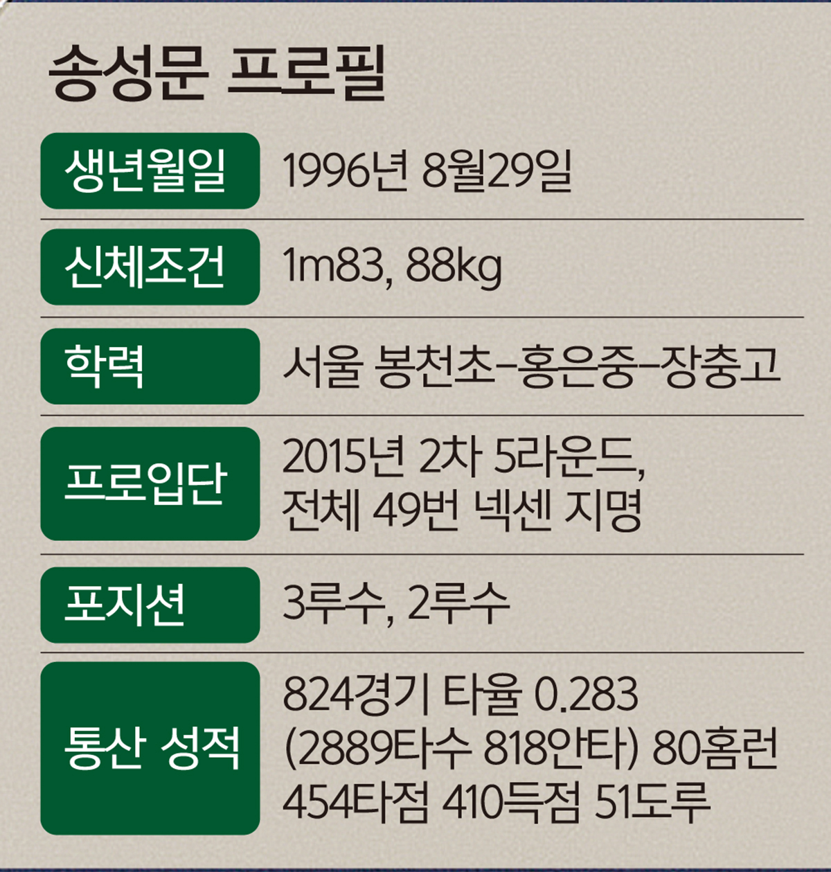 김혜성 송성문 스스로도 “나는 딱 두 시즌만 잘했다”고 몸을 낮춘다. 히어로즈 선후배들은 송성문을 ‘오랫동안 재능을 살리지 못한 선수’라고 기억한다. 송성문의 1년 선배인 김하성은 “성문이는 좋은 재능을 갖춘 선수였다. 그런데 그 재능을 살리지 못했다”며 “같은 팀에서 뛸 때 ‘정신 차려’라고 쓴소리도 했다. 지금은 빅리그에 도전할 만한 선수가 됐다”고 말했다. 이정후도 “성문이 형은 예전에는 포기가 빨랐다. 두 타석에서 범타로 물러나면 기가 죽었다”며 “지금은 엄청난 노력으로 최고의 선수가 됐다. 성문이 형을 응원한다”고 밝혔다.