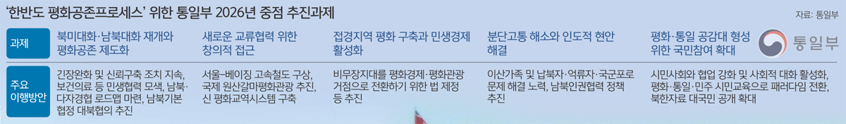 이재명정부가 2026년을 ‘한반도 평화공존 프로세스’의 원년으로 삼겠다는 목표를 밝혔다. 새해에는 남북관계 개선 및 긴장 완화의 분기점을 만들 수 있을지 관심이 쏠린다. 장기간 고착화된 남북 간 단절 상태에 변화가 있으려면 외부 환경도 따라줘야 하는데, 가장 큰 변수로 평가되는 러시아와 우크라이나 간 종전협상이 속도를 내고 있다. 내년 4월로 예상되는 도널드 트럼프 미국 대통령의 방중 역시 한반도 정세에 분수령이 될 것이란 전망이 나온다. 정부는 이러한 대북 정책의 성공적인 추진을 위해 통일부를 중심으로 관계 부처, 주변국과 긴밀한 공조에 나설 방침이다. 이명박정부 이후 줄곧 대북 정책 주도권을 쥐었던 외교부는 약 17년 만에 키를 통일부에 넘기고, “통일부의 이상이 현실이 되도록 외교적 노력을 다하는”(조현 외교부 장관) 데 집중할 예정이다. 이는 대북 정책의 초점을 미국 등 국제사회와 보조를 맞추는 데 둬 온 기존 방식을 남북 양자 중심으로 풀어가는 형태로 다시 전환하는 것으로 분석된다.