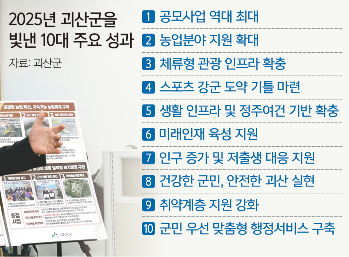 충북 괴산군이 올 한 해를 ‘역대급 성과’와 ‘선순환 구조’로 요약했다. 송인헌 괴산군수는 22일 군청 브리핑룸에서 “중앙부처와 국회를 수십 차례 오가며 발품 행정을 펼친 결과 대규모 정부사업에 연이어 선정돼 재정 건전성을 높이고 지역 발전 전략의 추진력을 마련했다”고 밝혔다. 그는 올해 10대 성과로 △역대 최대 정부사업 확보 △농업 지원 확대 △체류형 관광 인프라 확충 △스포츠 강군 기틀 마련 △생활 인프라 확충 △미래인재 육성 △저출생 대응 △군민 건강·안전 강화 △취약계층 지원 △맞춤형 행정서비스 구축을 꼽았다.