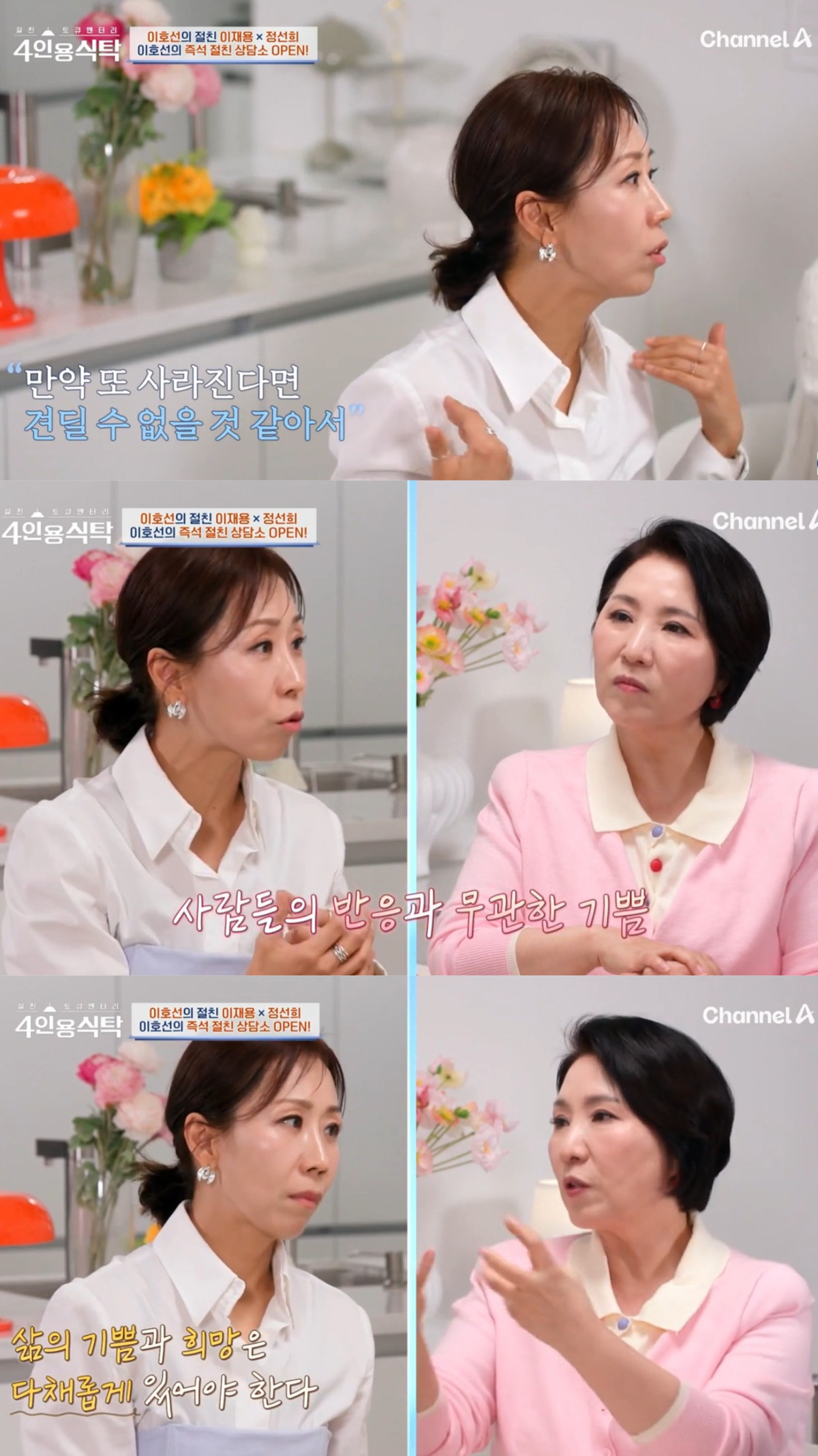 정선희가 사별 후 악플로 힘들었을 때 어머니의 말에 일어섰다고 말했다. 유튜브 채널 '채널아하: 채널A Health & Asset' 영상 캡처 코미디언 정선희가 故 안재환과 사별 후 악플로 힘들었을 때 어머니의 말에 일어설 수 있었던 이야기를 풀어놓았다. 지난 22일 방송된 채널A ‘절친 토큐멘터리 - 4인용식탁’은 상담가 이호선 편으로 꾸려졌다. 이날 방송은 아나운서 이재용, 코미디언 정선희가 함께해 각자의 고민을 털어놓고 이호선 교수에게 상담을 받았다.