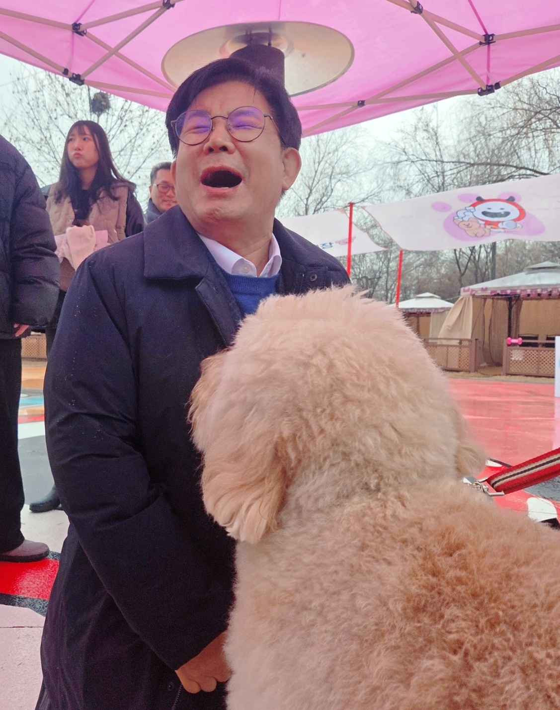박강수 마포구청장이 홍보대사견 바오의 애교에 환하게 웃고 있다. 박재림 기자 박 구청장은 “반려동물도 가족이 시대 아닌가. 마포구는 반려동물과 함께할 수 있는 곳이 많고, 반려문화가 시작되는 펫세권 1위라는 자부심이 있다”며 “오늘처럼 비가 오는 날에도 함께 시간을 보낼 수 있는 곳이 있다는 것 역시 의미 있다”고 말했다.