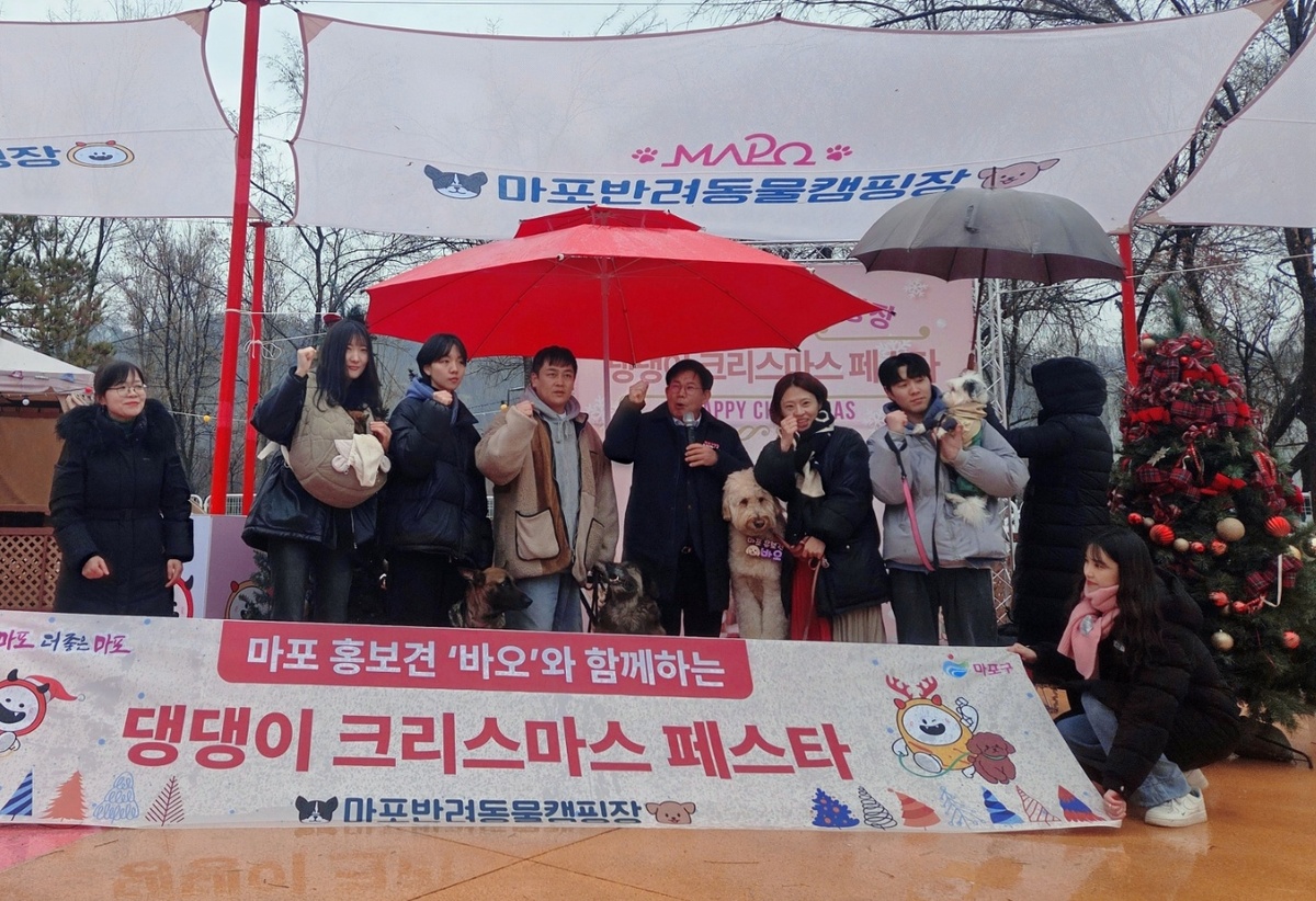 마포구 홍보대사견 바오가 개인기 중 하나인 ‘사랑해’를 하고 있다. 박재림 기자 한편 마포반려동물캠핑장에서는 오는 31일까지 댕댕이 크리스마스 페스타가 열린다. 반려견 성탄절 복장 체험 및 포토존 등 즐길거리가 준비돼 있다.