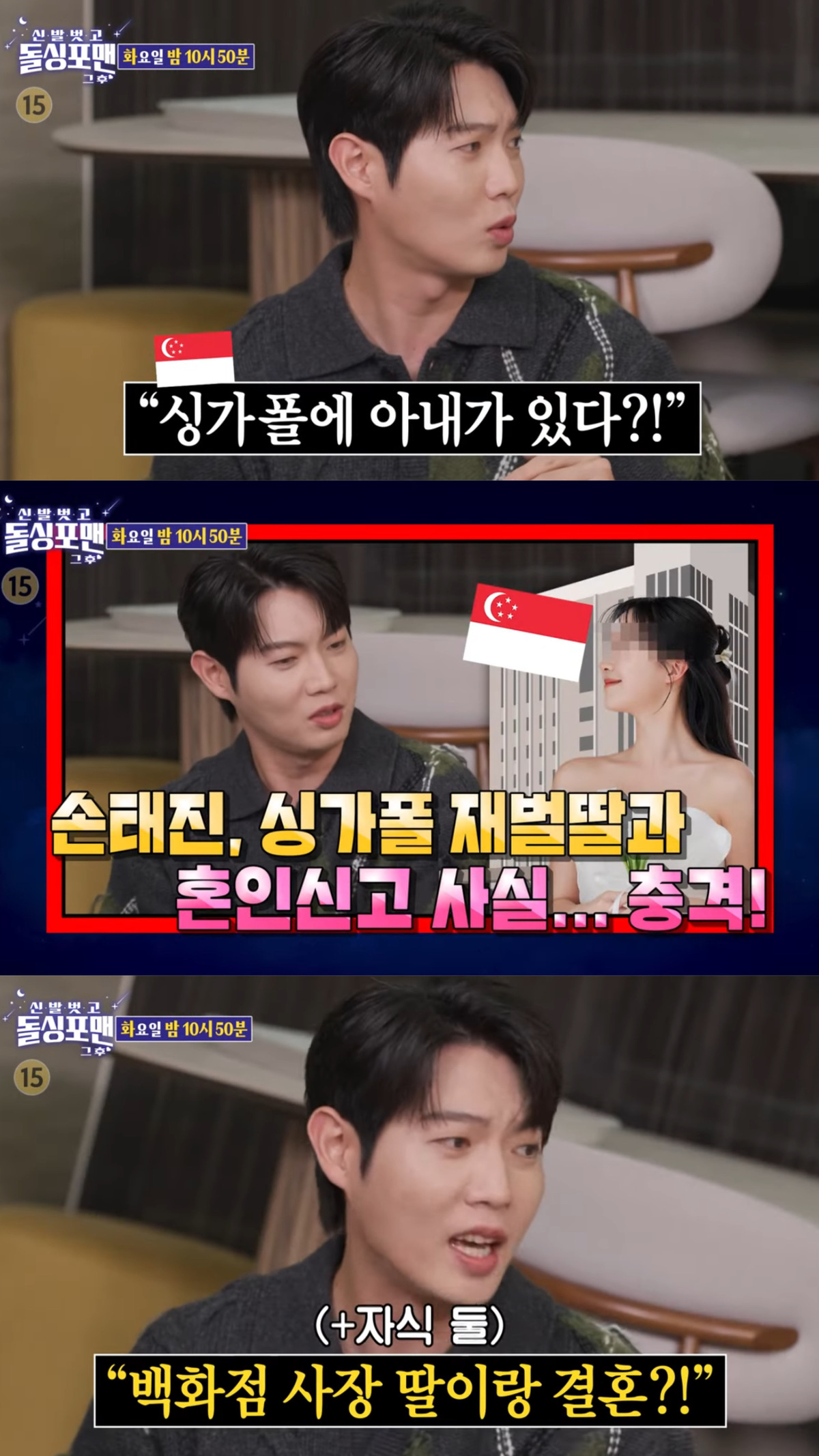손태진이 결혼했다는 건 가짜 뉴스였다. SBS '신발 벗고 돌싱포맨' 제공 이를 비롯해 ‘싱가폴에도 아내와 아이 둘이 있고, 아내는 백화점 사장 딸이라더라’, ‘축하한다’는 댓글이 달리기도 했다”라면서 이는 모두 가짜 뉴스라고 밝혔다. 이를 들은 탁재훈은 ‘서울대 출신’으로 알려진 손태진의 학력을 의심하기도 했는데, 손태진은 “정식으로 들어갔다. 외국인 전형으로 들어갔지만, 그 경쟁률도 14:1이었다”라고 말했다.