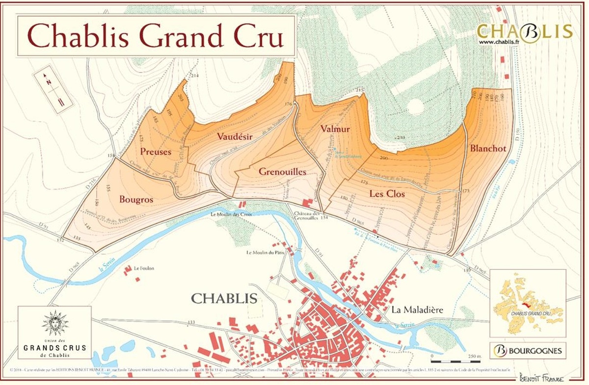 샤블리 그랑크뤼. 부르고뉴와인협회 ▶그랑 크뤼 1938년 AOC 제정. 면적 99ha. 하나의 AOC 아래 7개의 끌리마로 구성됐습니다. 포도밭은 모두 키메리지앙 지층이 곳곳에 노출되는 세렝 강 우안의 가파른 남향·남서향 경사면에 있어 아침부터 저녁까지 일조량이 좋습니다. 지도에서 보면 왕관 모양입니다. 수확한 다음 해 최소한 3월15일까지 숙성합니다. 이 지역에서 생산되는 와인은 완전히 익은 과실 풍미가 바탕에 깔리며 오크 숙성에서 비롯된 버터스카치, 베이킹 스파이스, 토피와 같은 향을 지니는 동시에 샤블리 특유의 균형감과 구조를 유지하는 것이 특징입니다.
