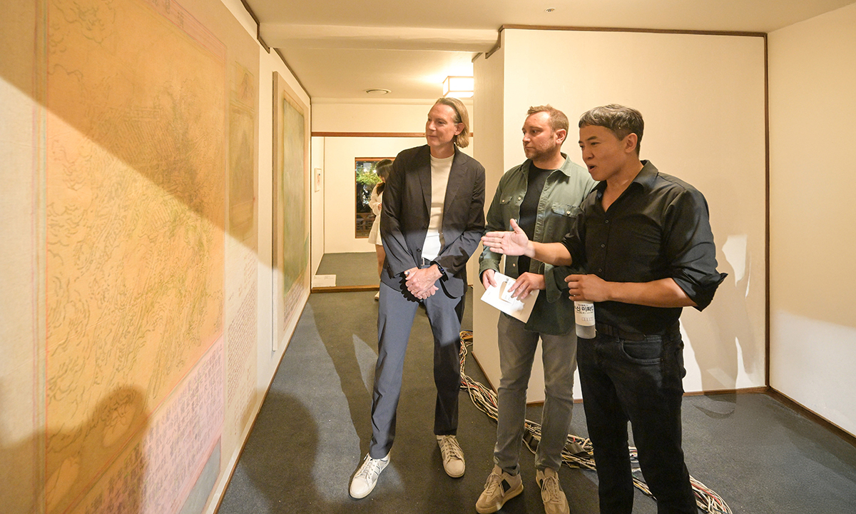 지난 4일 오후 서울 종로구 휘겸재에서 열린 ‘삼청 나이트 네트워킹 파티’에서 국내외 미술계 관계자들이 전시를 관람하고 있다. 예술경영지원센터 제공 아울러 다양한 층의 관람객이 함께 미술을 즐길 수 있는 자리도 다채롭게 마련됐다. 지난 4일 서울 종로구 북촌 휘겸재에서 열린 ‘삼청 나이트 네트워킹 파티’가 대표적이다. 외국인 관광객이 붐비는 한옥에서 현대미술을 감상하는 이색적인 경험에 관람객들 반응이 좋았다. 가족과 함께 온 한 관람객은 “밤에 볼 수 있는 한옥만의 특유한 분위기가 있는데 현대미술과 잘 어우러져 특별한 느낌을 받았다”고 말했다. 휘겸재에서는 지난 3월 아트바젤 홍콩에서 신진 작가상을 수상한 신민 등 한국 신진작가 10인의 작품으로 구성된 2025 우수 전속작가 기획전 ‘다이얼로그: 수신 미확인’도 15일까지 연다. 지난해부터 문체부와 예술경영지원센터(예경)의 전속작가제 지원으로 여러 아트페어에 참가한 신민 작가는 “전속작가제 같은 국내 지원과 더불어 해외 전시, 레지던시와 연결될 수 있는 지원이 확대되면 청년 작가들이 더 넓은 장에서 경쟁력을 쌓을 수 있을 것”이라고 말했다. 전속작가제는 문체부와 예경이 2019년부터 젊은 미술작가들의 안정적인 활동 기반 구축을 위해 작가와 전속계약을 맞은 화랑 등을 지원하는 사업이다.
