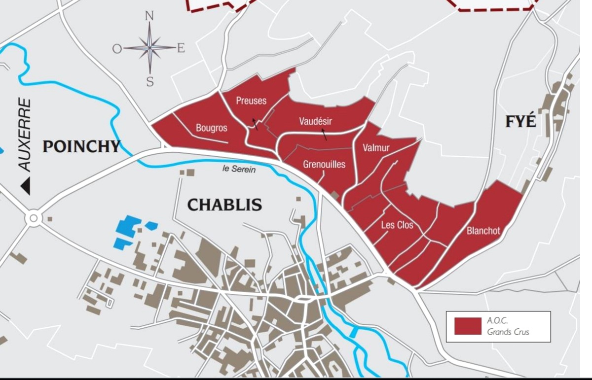 그랑크뤼 7개 끌리마. 부르고뉴와인협회 ◆샤블리 그랑크뤼 샤블리를 남북으로 흐르는 세렌강 우안에서도 남향을 살짝 바라보는 언덕 위쪽에 샤블리 최고 밭인 그랑크뤼가 몰려 있습니다. 포도밭 지도에서 보면 왕관 모양처럼 보입니다. 세렌강의 반사되는 빛이 일조량을 더해 포도를 잘 익게 도와줍니다. 샤블리 그랑크뤼 AOC는 한 개이지만 모두 7개 끌리마로 구성돼 레이블에 밭 이름을 표기할 수 있습니다. 가장 큰 끌리마가 레 끌로(Les Clos)로 생산량이 가장 많고 그르누이(Grenouilles), 부그로(Bougros), 프뢰즈(Preuses), 보데지르(Vaud?sir), 발뮈르(Valmur), 블랑쇼(Blanchot)로 샤블리 그랑크뤼가 구성됩니다. 그르누이 포도밭의 이름이 재미있습니다. ‘개구리들’이란 뜻으로 세렌강과 가장 가가까운 포도밭인데 인근 집들의 조명이 켜지면 개구리들이 강가로 올라와서 이럼 이름을 얻었습니다.
