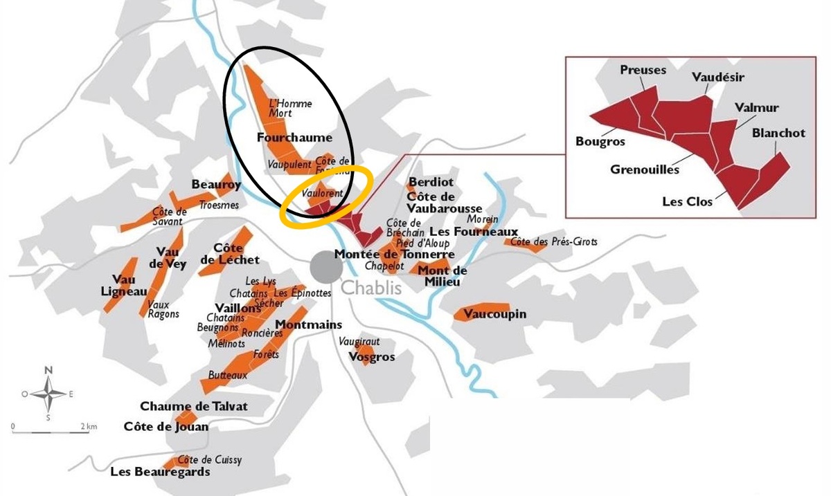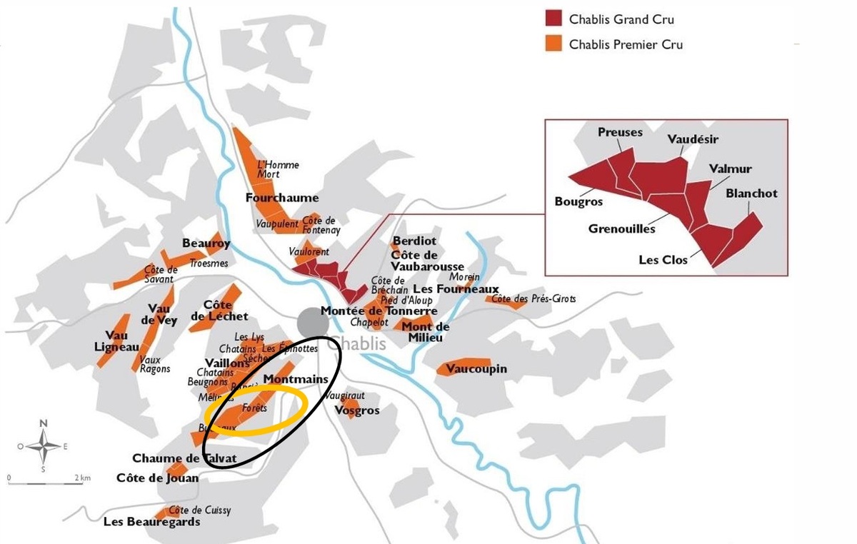 샤블리 위치. WSG 프랑스 부르고뉴 최북단 와인 산지 샤블리는 뛰어난 포도가 생산되는 끌리마(Climats)가 모두 47개입니다. 샤블리 프리미에 크뤼에 40개가 몰려있고, 샤블리 그랑크뤼 크뤼는 7개입니다. 클리마는 샤블리를 남북으로 관통하는 세랭(Serein) 강을 중심으로 좌안과 우안으로 나눠지며 위치, 고도, 일조방향에 따라 뚜렷하게 구분되는 캐릭터를 지녔습니다. 끌리마는 지질학적, 기후적 조건에 따라 수백 년 전부터 이름 붙여지고 경계가 그어진 특정 포도밭 구획을 의미합니다.