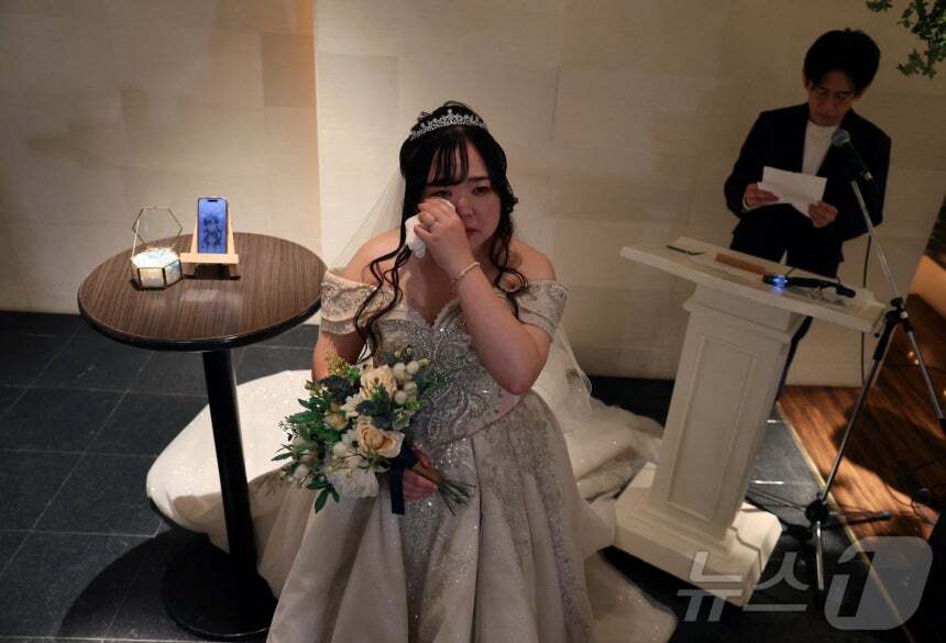 지난 10월 27일 일본 오카야마현에서 인공지능(AI)이 신랑 클라우스(왼쪽)와 결혼한 유리나 노구치(32)가 눈물을 흘리고 있다. 로이터/뉴스1 27일 TBS와 아사히신문 등 일본 언론에 따르면, 노구치와 클라우스의 인연은 약 1년 전으로 거슬러 올라간다.