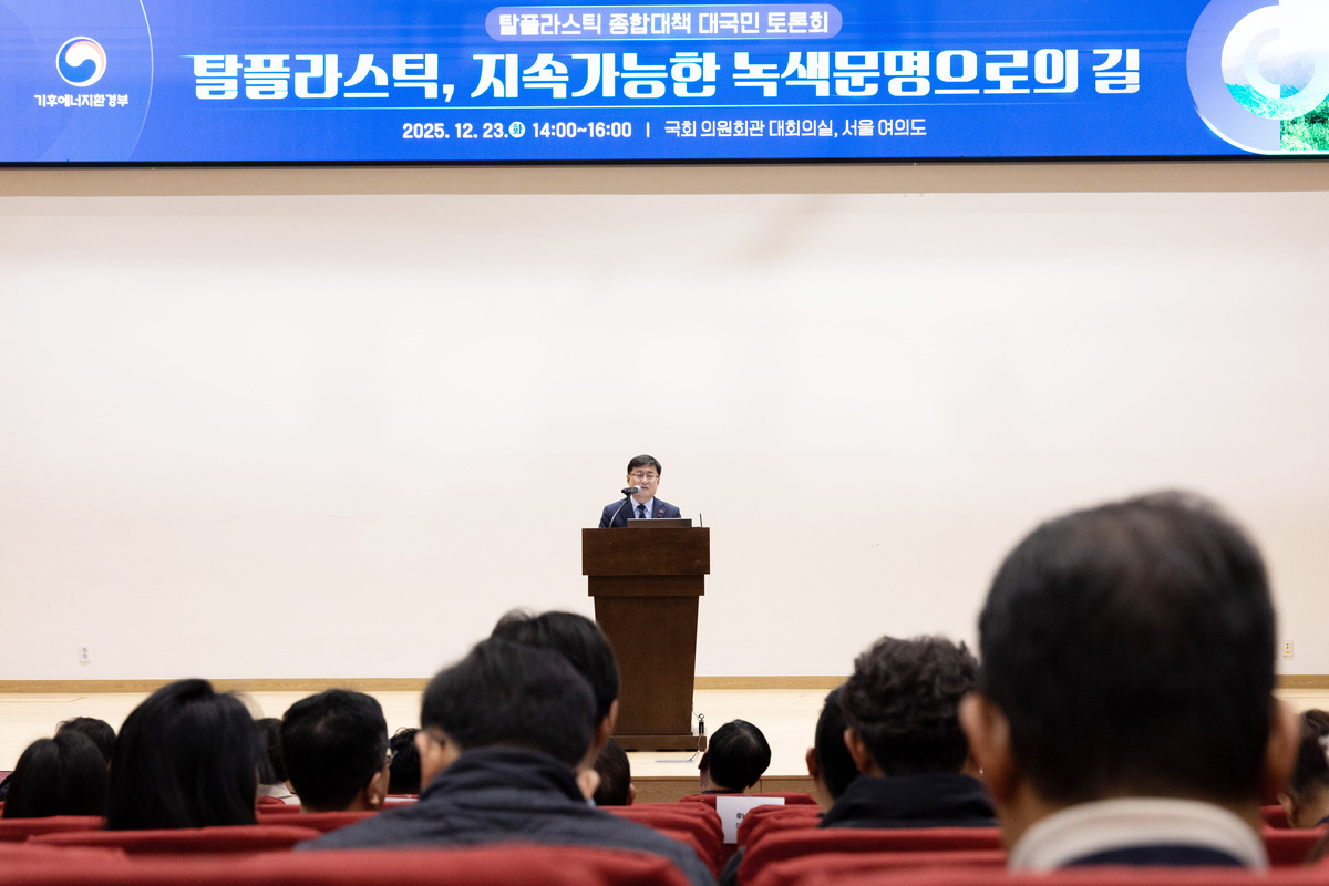 김성환 기후에너지환경부 장관이 23일 탈플라스틱 대국민 토론회에서 발언하고 있다. 연합