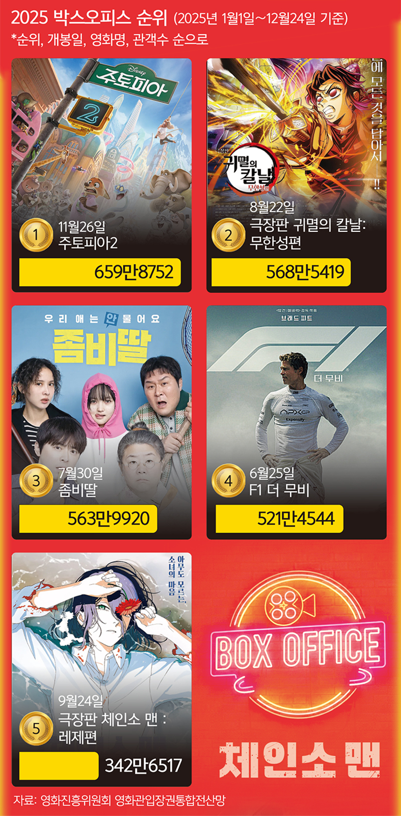 2025년 한국 극장가 승자는 명확하다. 실사 영화가 아닌 애니메이션이 박스오피스를 장악했다. 일본 애니메이션 ‘극장판 귀멸의 칼날: 무한성편’(‘무한성편’)은 한국형 휴먼 코미디 ‘좀비딸’을 눌렀고, ‘극장판 체인소 맨: 레제편’(‘레제편’)은 할리우드 대작 ‘미션 임파서블: 파이널 레코닝’을 제쳤다. 여기에 디즈니 애니메이션 ‘주토피아 2’가 최강자로 가세하며 올해 박스오피스 구도를 완성했다.