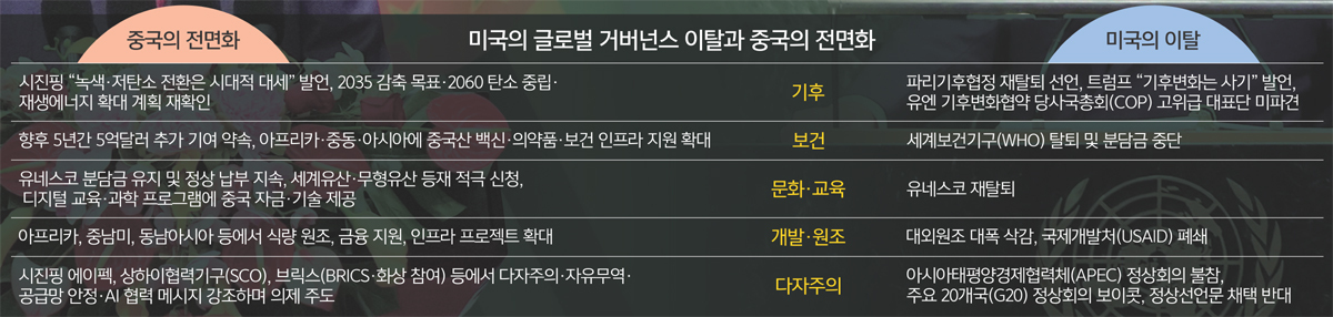 2025년 들어 국제기구와 다자 정상회의에서 나타난 가장 뚜렷한 기류를 꼽자면, 미국의 이탈과 그로 인해 더욱 선명해진 중국의 부상이다. 중국은 그동안 기후, 보건, 개발, 기술 규범의 여러 영역에서 역할을 확대해 왔지만 중심에 있지는 않았다. 그러나 미국이 협의의 핵심축에서 잇달아 물러나면서 중국의 존재감이 전면에 부각되기 시작했다.