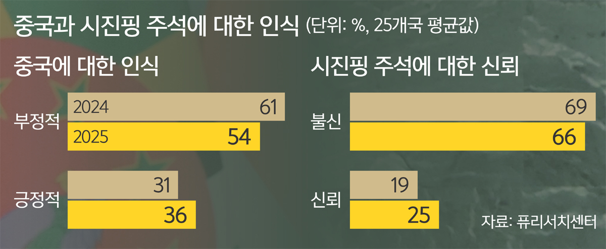 중국의 이 같은 전략은 트럼프 2기 들어 효과가 나타나고 있는 것으로 보인다. 지난 7월 미국 퓨리서치센터가 25개국을 대상으로 실시한 조사에 따르면 중국에 대한 호감도는 31%에서 36%로 상승했고, 비호감도는 61%에서 54%로 낮아졌다. 퓨리서치센터는 “중국에 대한 인식이 여전히 부정적이지만, 상승세로 돌아선 것은 2020년 팬데믹 이후 처음”이라고 평가했다.