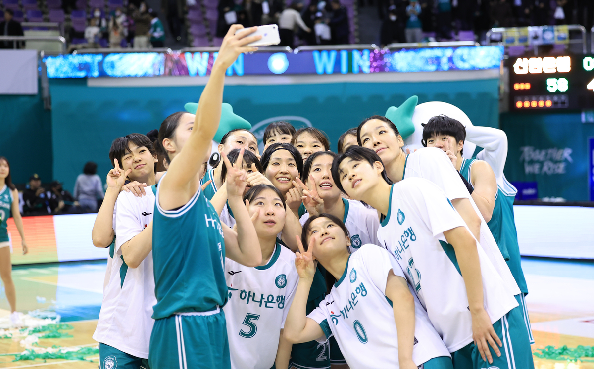 하나은행 선수들이 지난 8일 부천체육관서 열린 신한은행전 종료 후 승리 기념 단체 사진을 촬영하고 있다. 사진=WKBL 제공