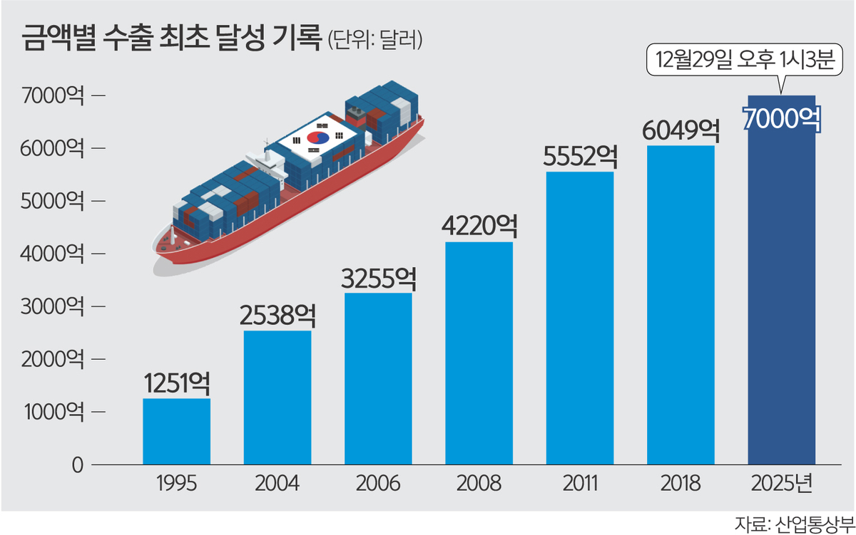 올해 한국 수출이 사상 처음으로 7000억달러를 돌파했다. 7000억달러 수출은 전 세계 6번째로, 2018년 6000억달러 달성 이후 7년 만의 성과다. 대내외 불확실성 속에서도 반도체·자동차 등 주력 산업이 회복 국면에 진입했고, 인공지능(AI)을 비롯한 중장기 성장 산업이 수출을 견인했다는 점에서 의미가 크다. 29일 산업통상부·관세청에 따르면 이날 오후 1시3분 기준, 올해 연간 누적 수출액 7000억달러를 달성한 것으로 잠정 집계됐다.