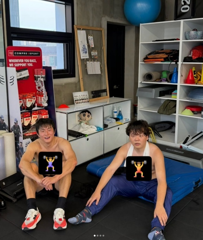 사진 속 곽튜브는 웹툰작가 겸 방송인 기안84와 체육관 바닥에 앉아서 쉬고 있다. 또 상의를 탈의하고 러닝머신을 뛰는 모습도 볼 수 있다.