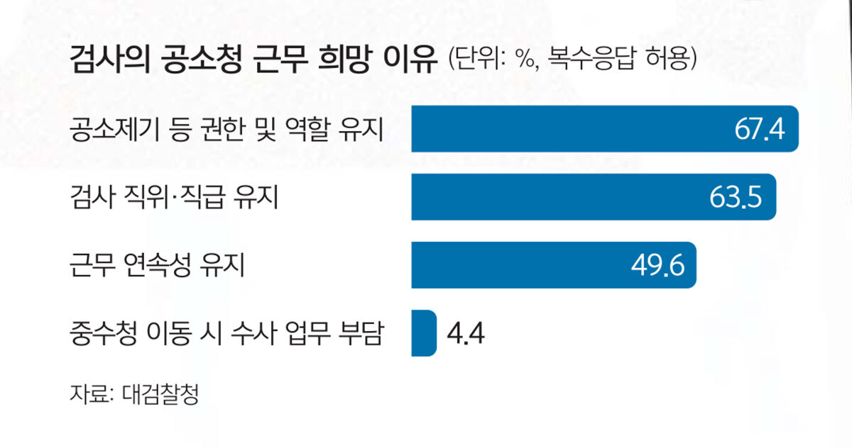 대검찰청 검찰제도개편 태스크포스(TF)가 지난 11월 5∼13일 검찰 구성원 전체를 대상으로 진행한 설문조사 결과, 설문에 응한 검사의 77%가 공소청 근무를 희망했다. 중수청 근무를 희망한 검사는 0.8%에 그쳤다. 18.2%는 결정하지 못했다고 답했다. 전체 검찰 구성원으로 넓혀봐도 공소청 근무 희망자가 59.2%였던 반면, 중수청 근무 희망자는 6.1%에 불과했다.