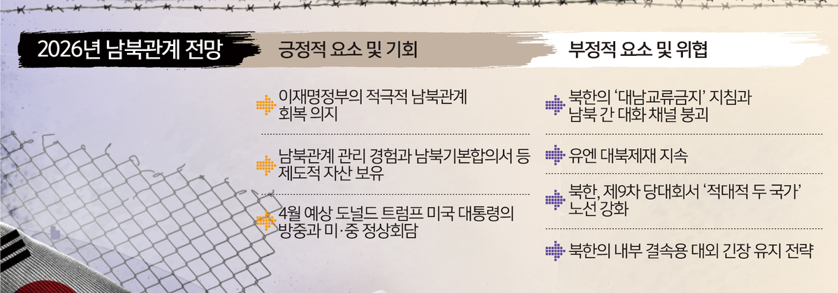 북한이 헌법까지 개정하며 ‘적대적 두 국가론’을 강화하고, 윤석열정부가 강경한 대북정책을 분명히 하면서 최근 몇 년간 남북관계는 모든 면에서 교착상태에 빠졌다. 긴장감 가득한 한반도 정세를 이어받은 이재명정부는 교류·협력에 방점을 두며 북한을 대화의 장으로 이끌어내 보겠다는 의지가 분명하다. 이재명 대통령은 “끊임없이 선의를 전하고 노력해 바늘구멍이라도 뚫어야 한다”고 강조했다. 하지만 현실적 성과를 내기가 쉽지 않을 것이라는 게 대체적인 분석이다. 남한을 적대시하는 북한의 태도가 워낙 완고하기 때문이다. ◆바늘구멍이라도… 지속·제도적 교류·협력 추진