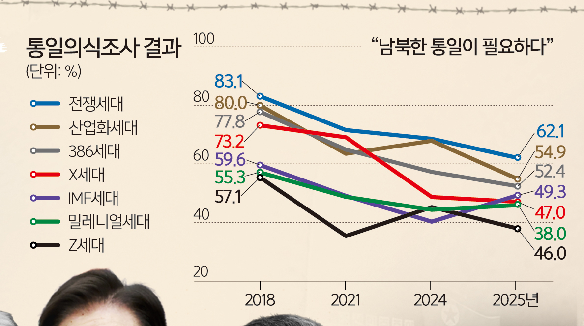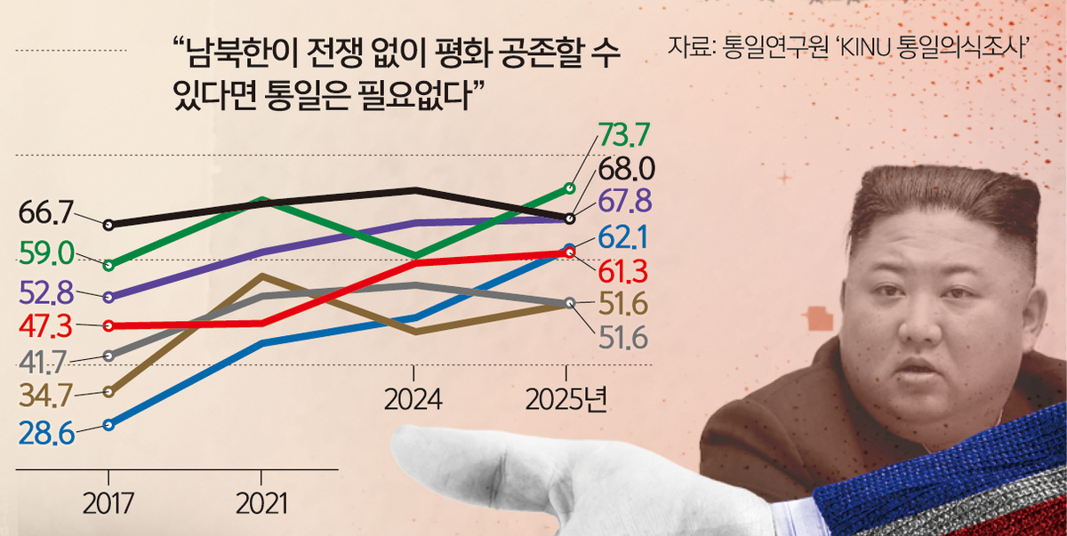 이런 여론 지형은 대북정책을 둘러싼 첨예한 논쟁을 낳는다. 정동영 통일부 장관이 주창한 ‘평화적 두 국가론’이 대표적이다. 정 장관은 “통일을 지향한다”는 단서를 달았지만 남북이 현실적으로 두 국가라고 주장했다. 이를 두고 영구분단을 인정하는 반헌법적 인식이라는 비판이 잇따랐다. 한·미 연합훈련을 축소해 대화 분위기를 조성해야 한다는 주장을 두고도 ‘북한 눈치 보기’라는 비난이 거셌다.