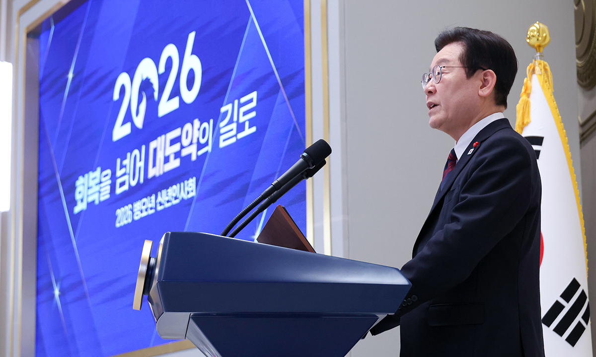 이재명 대통령이 2일 청와대 영빈관에서 열린 2026년 신년 인사회에서 발언하고 있다. 청와대통신사진기자단 이 대통령은 또 “대도약의 과업 앞에 서 있는 우리 모두에게 가장 필요한 것은 익숙한 옛길에서 벗어나 끊임없이 혁신하며 대전환의 길로 거침없이 나아가는 용기”라며 “자원의 집중과 기회의 편중이 성장을 가로막고 경쟁과 갈등의 악순환으로 이어지는 오늘에는 우리가 과감히 기존의 성장 전략을 대전환해야 한다”고 강조했다. 이어 “기회와 과실을 모두가 함께 고루 나누는 ‘모두의 성장’만이 우리 대한민국을 대도약의 미래로 이끌 지름길”이라며 “공동체와 국민 전체의 역량으로 이뤄낸 이 경제 성장의 결실이 중소기업, 벤처기업까지 흐르고 국민 한 분 한 분이 체감할 수 있는 삶의 변화로 이어져야 한다”고 말했다. 이날 신년인사회에는 5부 요인인 우원식 국회의장·조희대 대법원장·김상환 헌법재판소장·김민석 국무총리·노태악 중앙선거관리위원장 등이 참석했다. 여야 대표와 원내대표 등도 초청됐지만 장동혁 대표를 비롯한 국민의힘 지도부는 불참했다. 정치권 인사 외에 주요 경제단체 대표와 노동조합 위원장 등 재계·노동계 인사들도 자리했다.