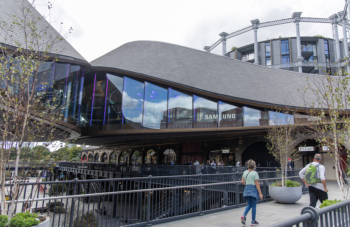 영국 런던 킹스크로스에 있는 삼성전자 매장 '삼성 KX'는 아늑한 분위기 속에 최신제품을 배치해, 삼성의 ‘AI홈’을 자연스럽게 체험할 수 있도록 했다. 삼성전자 제공 삼성전자 브랜드 쇼케이스 공간인 삼성 KX는 2019년 9월 런던 킹스크로스 일대를 한눈에 조망할 수 있는 ‘콜 드롭스 야드’ 쇼핑몰 최상층에 문을 열었다. 총 1858㎡ 규모다. 킹스크로스는 산업혁명 시기 석탄을 영국 전역으로 실어나르던 산업의 중심지였다. 현재는 디자이너와 아티스트들이 모여드는 문화 명소이자, 구글·유튜브·메타·유니버셜 스튜디오·소니뮤직 등 글로벌 기업들이 둥지를 튼 테크 허브로 주목받고 있다. 삼성 KX는 많은 제품을 건조하게 늘어놓은 여느 가전 매장과 다르다. 곡선과 나무 위주의 널찍한 공간에 부엌과 거실을 들여놓아 낮잠이라도 잘 수 있을 듯 안락하다. 이런 분위기 속에 최신제품을 배치해, 삼성의 ‘AI홈’을 자연스럽게 체험할 수 있도록 했다.