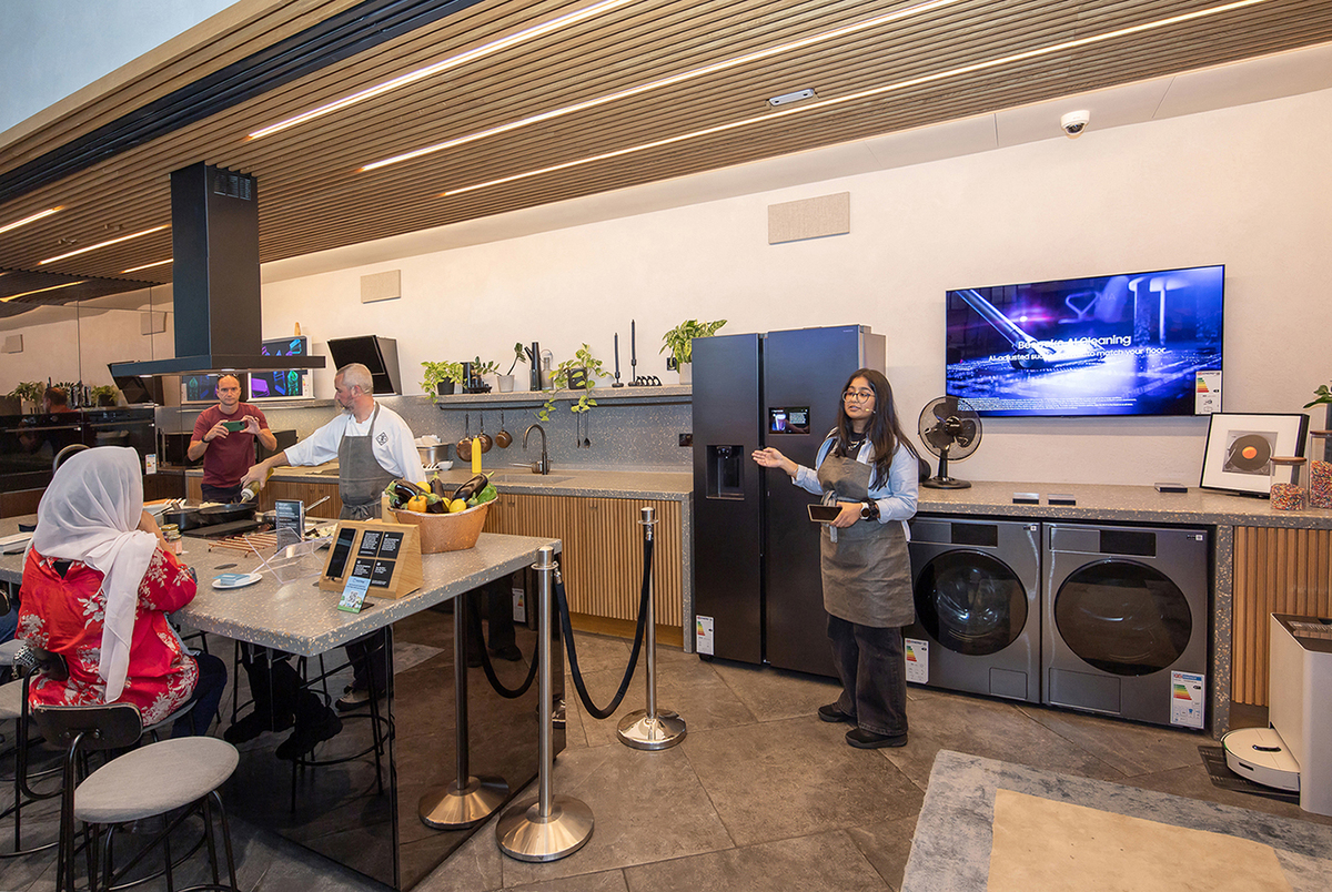 영국 런던 킹스크로스에 있는 삼성전자 매장 '삼성 KX'는 아늑한 분위기 속에 최신제품을 배치해, 삼성의 ‘AI홈’을 자연스럽게 체험할 수 있도록 했다. 삼성전자 제공 삼성 KX에서는 정보통신(IT) 기술과 런던의 문화·예술이 어우러진 행사가 종종 열린다. 약 30여개 대학, 교육기관, 지역단체, 재단 등과 협력해 예술활동 전시회, 각종 워크숍, 게임 이벤트, 명사 초청 강연 등 다양한 프로그램을 개최한다. 덕분에 지역 사회를 대표하는 ‘디지털 놀이터’로 자리잡았다. KX를 방문한 이날은 주방에서 셰프가 AI홈 솔루션을 이용해 방문객을 위한 요리를 만들고 있었다. 셰프의 시연을 지켜보던 40대 영국인 부부는 “지나다가 우연히 들렀는데 재밌다”며 웃어보였다. 삼성 KX에서 일한 지 7년된 한 영국인 직원은 “보통 가전매장은 여러 제품을 나열해 서로 비교할 수 있게 하지만 이 공간에서는 삼성 가전이 우리 집에 오면 이렇겠구나 하고 이해할 수 있게 최적의 위치에 놓아둔다”고 설명했다. 그는 “고객들이 이곳에 제품을 사러 오는 건 물론 제품에 대해 알아보거나 수리를 맡기러 들르기도 하고, 휴일에는 아이들이 와서 게임하고 여기저기 돌아다니는 등 그저 즐기기 위해 찾기도 한다”고 전했다.