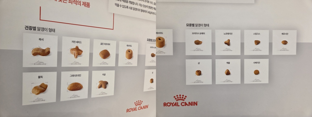 로얄캐닌 브랜드숍 전시 공간에 고지된 반려견과 반려묘의 종에 따라 가장 알맞은 사료 알갱이 모양 정보. 박재림 기자